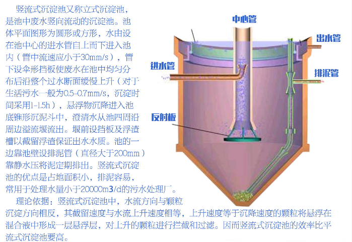 流式沉淀池是一種常用的沉淀池類型,其特點是水流方向與沉淀方向一致,從而提高了沉淀效果。豎流式沉淀池通常由池體、進(jìn)水管、出水管、排泥管等部分組成。