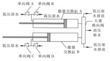 低壓原水從單向閥 A 或單向閥 C 進入能量回收裝置,充滿能量交換缸 A 或 能量交換缸 B;高壓濃水從五通換向閥進入能量回收裝置,當五通換向閥使高 壓濃水與能量交換缸 A 連通時,高壓濃水將能量傳遞給低壓原水,實現(xiàn)能量交 換,高壓原水從單向閥 B 進入反滲透膜壓力容器進行脫鹽處理;待將能量交換 缸 A 中的原水全部加壓送至反滲透系統(tǒng)后,五通換向閥,將高壓濃水與能量交 換缸 B 連通,重復上述能量交換過程,同時能量交換缸 A 中低壓原水進入,排 出低壓濃水。兩個能量交換缸交替進行高壓濃水與低壓原水的能量交換,實現(xiàn) 將低壓原水連續(xù)增壓送至反滲透系統(tǒng)進行脫鹽處理。