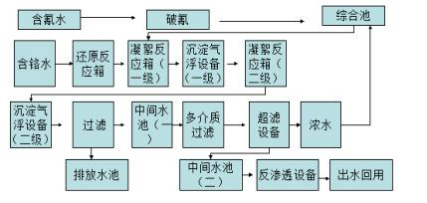 采用物理化學(xué)方法對(duì)電鍍廢水中的重金屬進(jìn)行分離處理,通過(guò)兩次調(diào)節(jié)廢 水的 pH 值,使廢水中堿性重金屬離子和中性重金屬離子分別在其最佳的沉淀 環(huán)境內(nèi)進(jìn)行沉淀分離, 達(dá)到去除重金屬的目的,使廢水達(dá)到《電鍍污染物排放 標(biāo)準(zhǔn)》(GB21900-2008)中的標(biāo)準(zhǔn),再對(duì)達(dá)標(biāo)的廢水進(jìn)行雙膜法(超濾膜+反 滲透膜)分離,進(jìn)一步去除水中的各類金屬離子,反滲透膜清水側(cè)出水達(dá)到電 鍍清洗工藝用水水質(zhì)標(biāo)準(zhǔn),回用于電鍍生產(chǎn)線,反滲透濃水側(cè)出水再經(jīng)過(guò)一次 物化沉淀,最終使?jié)馑_(dá)標(biāo)排放。